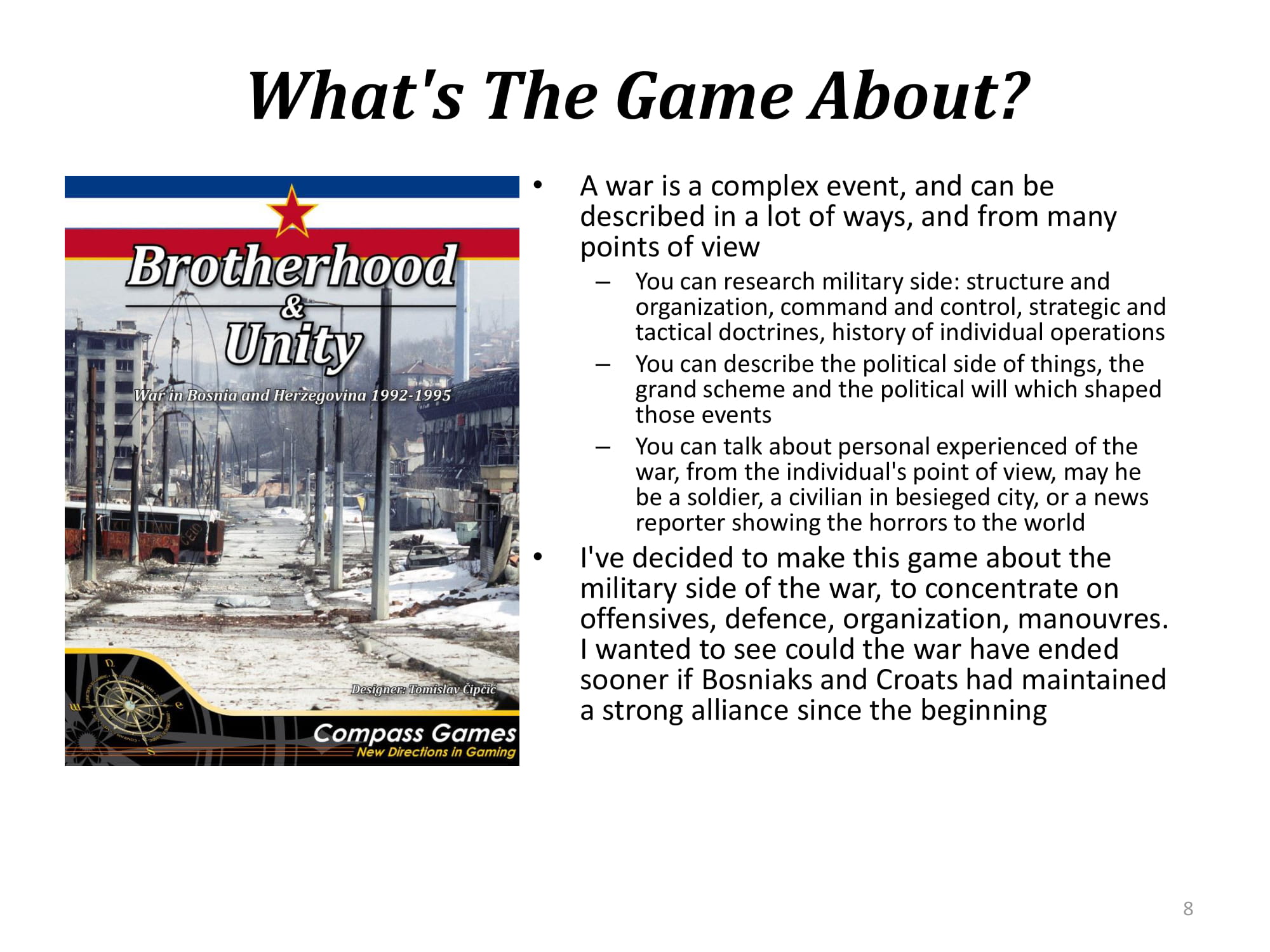 Tomislav ČipčićTomislav is a game designer and computer programmer from Croatia. He is currently designing with Compass Games, with his first published title being Brotherhood & Unity. Click here for our Interview with Tomislav Čipčić